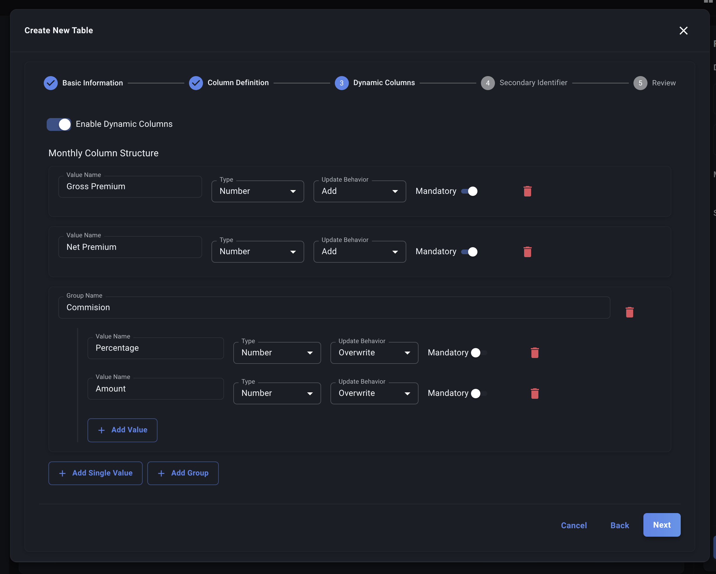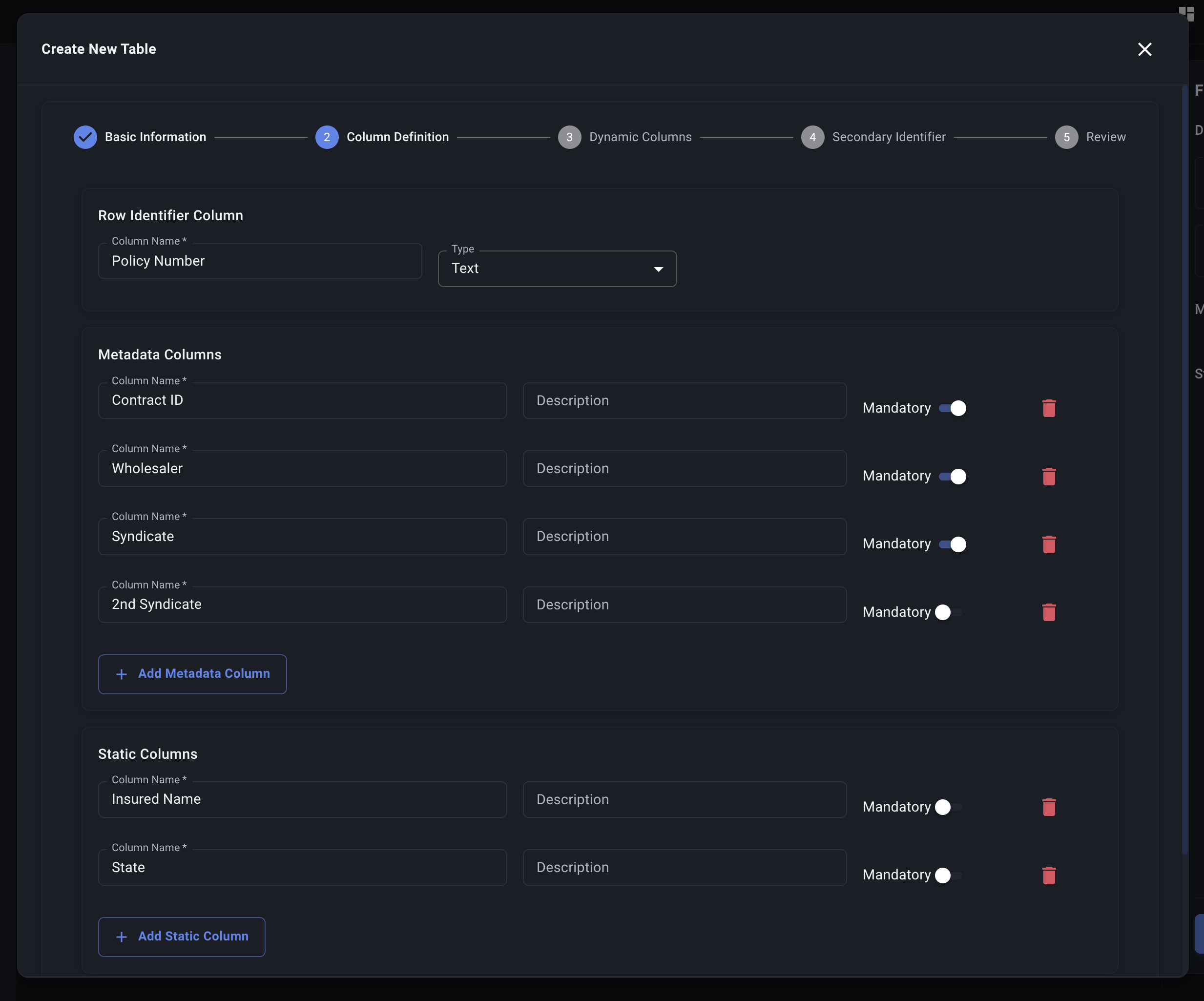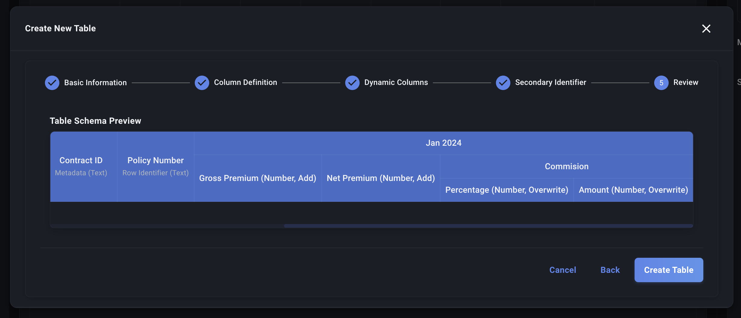 Creating a Table is the first step towards organizing and analyzing your insurance data within Decode. This process involves defining the structure (schema) that will hold your cleaned data. You'll use a multi-step form to specify the table type, time period (for Time Series tables), and the different types of columns your table will contain.